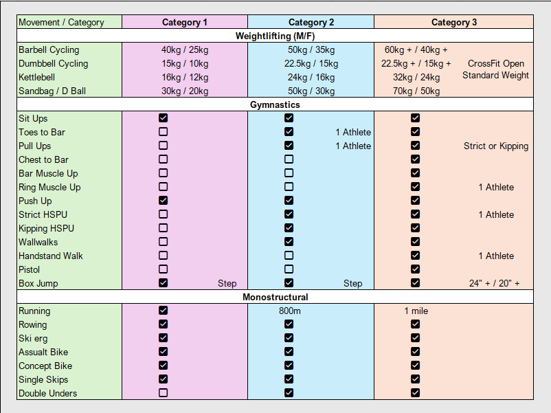 Our competitions are titled as either category 1, 2 or 3 which is a reference to the type of movements and the weights you can expect to see programmed in the events. We have listed these below and given weight limits for weightlifting movements.